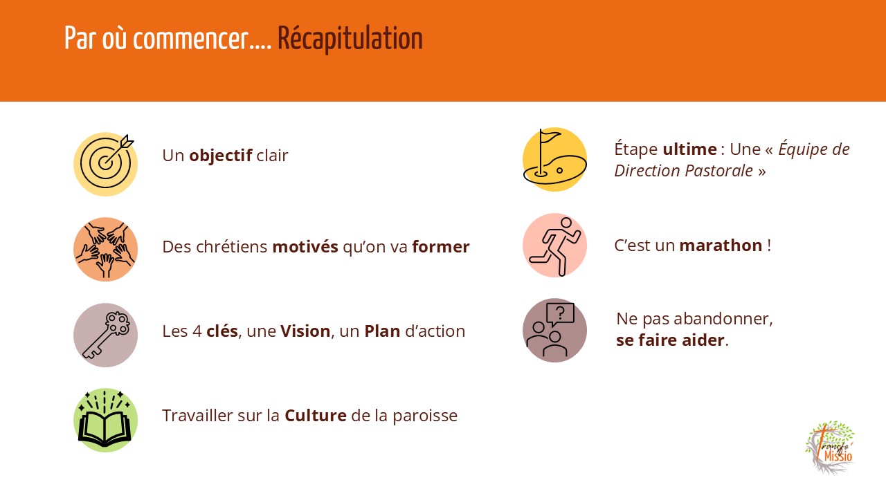 On pourra alors engager l’équipe Plan d’Action à élaborer et piloter un travail de fond en vue de l‘évolution de la culture de la paroisse, à piloter des petites actions de changement de culture suivant le les 4 clés citées précédemment. Par culture on entend ce qui se fait, ce qui est admis, ce qui est toléré et célébré au sein de la communauté paroissiale : le mode de gouvernance, le mode de relations, le mode de prière, le mode de communication, le mode d’ouverture au monde extérieur, . . . .