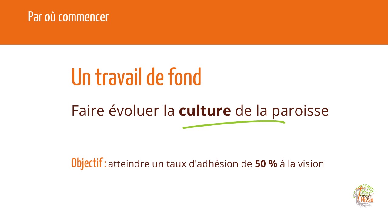 Ce travail de changement progressif de la culture est essentiel, c’est un travail de fond à soutenir avec persévérance et intentionnalité, sans jamais perdre le cap, sur plusieurs années, avec pour objectif d’entraîner au moins 50 % de la communauté dans une adhésion totale à la vision, les entraîner ainsi progressivement vers une nouvelle culture résolument missionnaire.