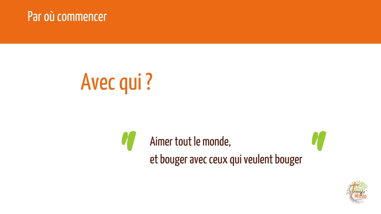 Le changement devra s’appuyer sur les personnes qui se sentent concernées par la Transformation Pastorale (TP), et qui veulent « bouger ». Pour désamorcer un éventuel sentiment de culpabilité, on veillera à : « Aimer chaque personne, et bouger avec ceux qui