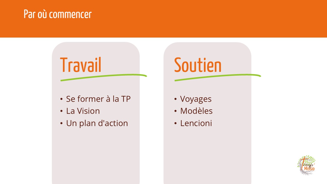 Ce groupe des personnes qui souhaitent « bouger », on va les former, les inviter à approfondir ce qu’est la TP, et identifier ceux qui sont prêts à se mettre au travail. Avec ceux-ci, on pourra commencer à élaborer une ébauche de Vision, et une ébauche de feuille de route pour les prochains mois. On pourra ainsi progressivement constituer d’une part une « équipe Vision », ceux qui rêvent à l’avenir et imaginent l’image de leur communauté paroissiale dans 5 ou 10 ans, et d’autre part une « équipe Plan d’action TP », ceux qui élaborent une stratégie, des étapes, des objectifs à atteindre, des événements à marquer, des ressources à identifier.